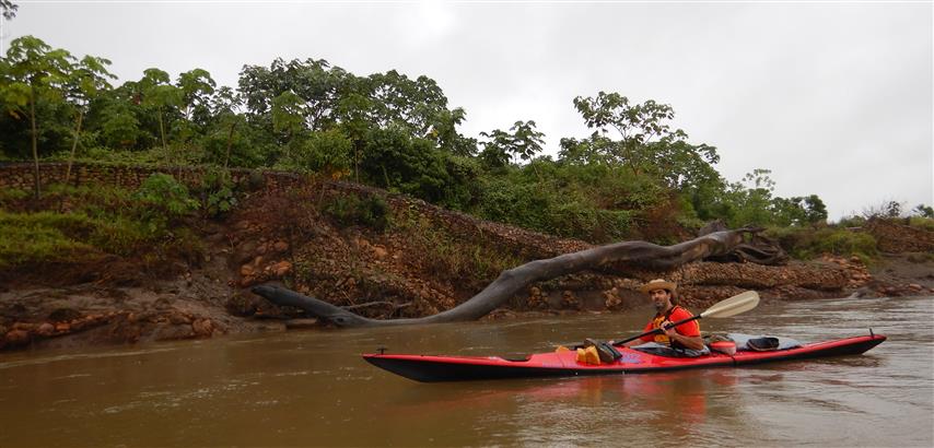 Santa Cruz, camioneta, taxi y al río Ichilo. Después de dar muchas vueltas decidimos bajar en el puente carretero sobre el río, cansados y con lluvia el escenario metía un poquito de presión. Es un rio grande rodeado de selva, rocas y con muchos árboles (coladores) en el cauce. Como solo habíamos podido ver el río por fotos satelitales de internet y no conseguimos ninguna información de nadie que lo haya navegado el embarque bajo la lluvia fue silencioso. Una vez en el río y sobre la corriente ya no hay vuelta atrás. Remontar el rio era imposible. Doscientos kilómetros del río Ichilo hasta entrar al Mamoré. Embarcamos y salimos, decidimos navegar solo dos horas río abajo y paramos en un banco de arena, uno de los primeros que vimos. No paro de llover nunca, por los grandes troncos enganchados por doquier supusimos que el rio en verano (temporada de lluvia) debía bajar muy grande. Carpa, mates, relajar un poquito después de un viaje largo (35 hs), música y chan, el rio había crecido mucho, tanto que durante la noche tuvimos que mover la carpa tres veces de lugar hasta entrar en la selva y el barro. Como siempre digo, el primer día te golpea un poco. Dormimos con un ojo abierto relojeando el río. Tres días nos llevó hacer 200 km por el Ichilo. En mitad del segundo día empezamos a ver algunas canoas de lugareños en la costa del río y o sorpresa un fuerte olor a solvente posiblemente ligado a la producción de cocaina, que sumado a un disparo dentro de la selva nos hizo contener la respiración y remar rápido. El río avanza y en cuestión de minutos dejamos atrás todo eso para seguir hacia el Mamoré.